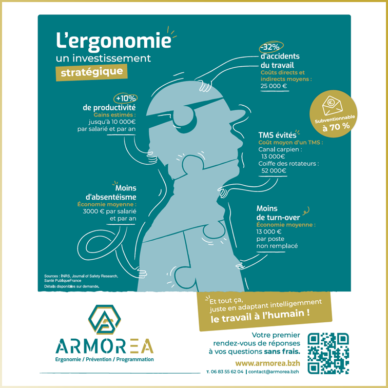 Mettre en lumière les bénéfices de l’ergonomie (En savoir + ), les économies possibles (En savoir + ) et rappeler qu’améliorer les conditions de travail n’est pas une dépense, mais un véritable investissement stratégique.